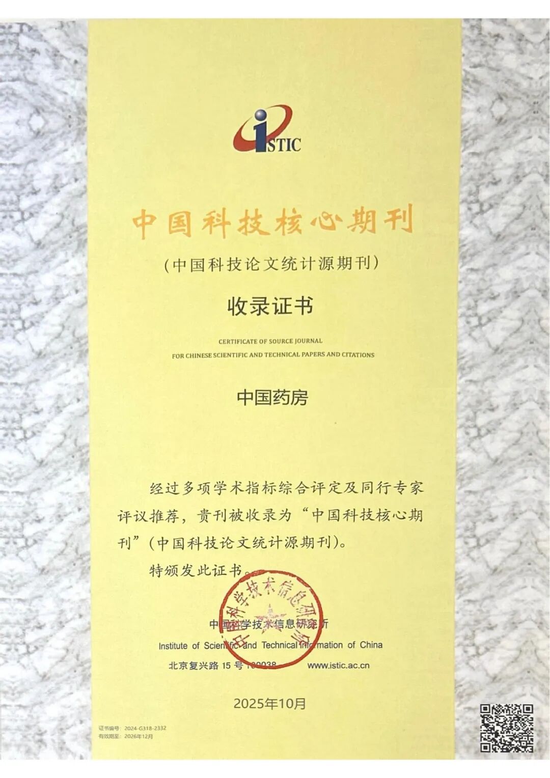 《中国药房》杂志再次入选“中国科技核心期刊”